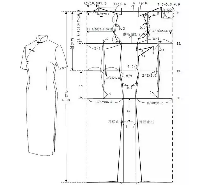 8.作胸围大B/4=22.5cm,臀围大H/4 =23.5cm。
