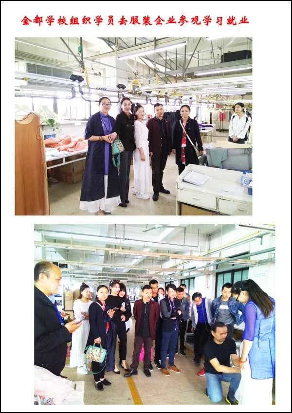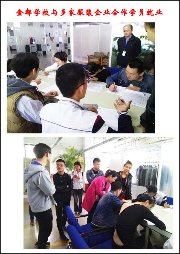 北京金都服装学校近年来为毕业生有一个好的就业出路,与北京多家品牌服装公司,红都,裂帛,蓝地,方士,滕氏,莱茵,顺美,亿都川等各大品牌服装企业共同联手开辟一条学生参观学习研论就业的新路。为许多毕业学员找到了适合自己的工作岗位。