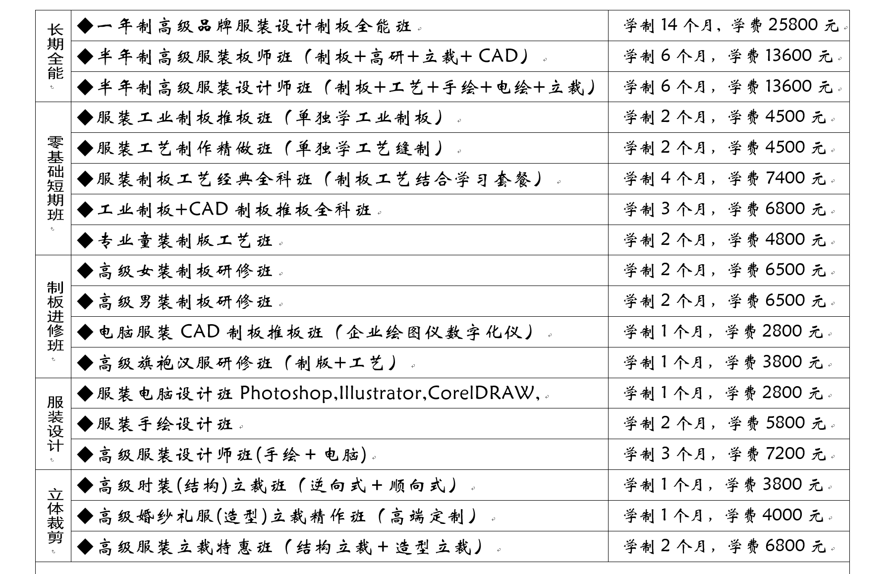 2) 高级研修(学习服装制板原理和结构变化规律) 2个月